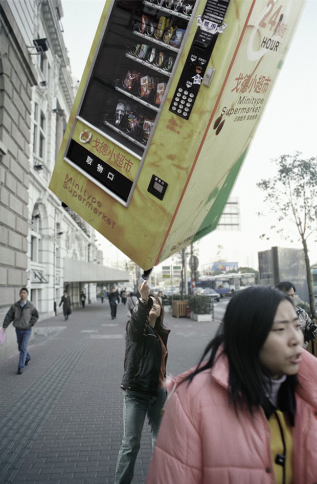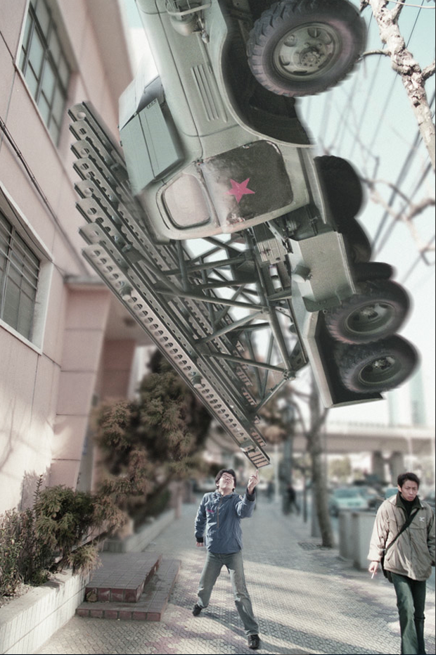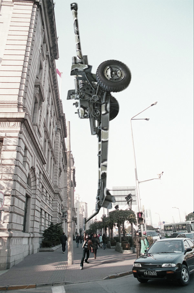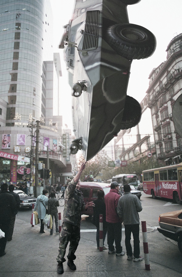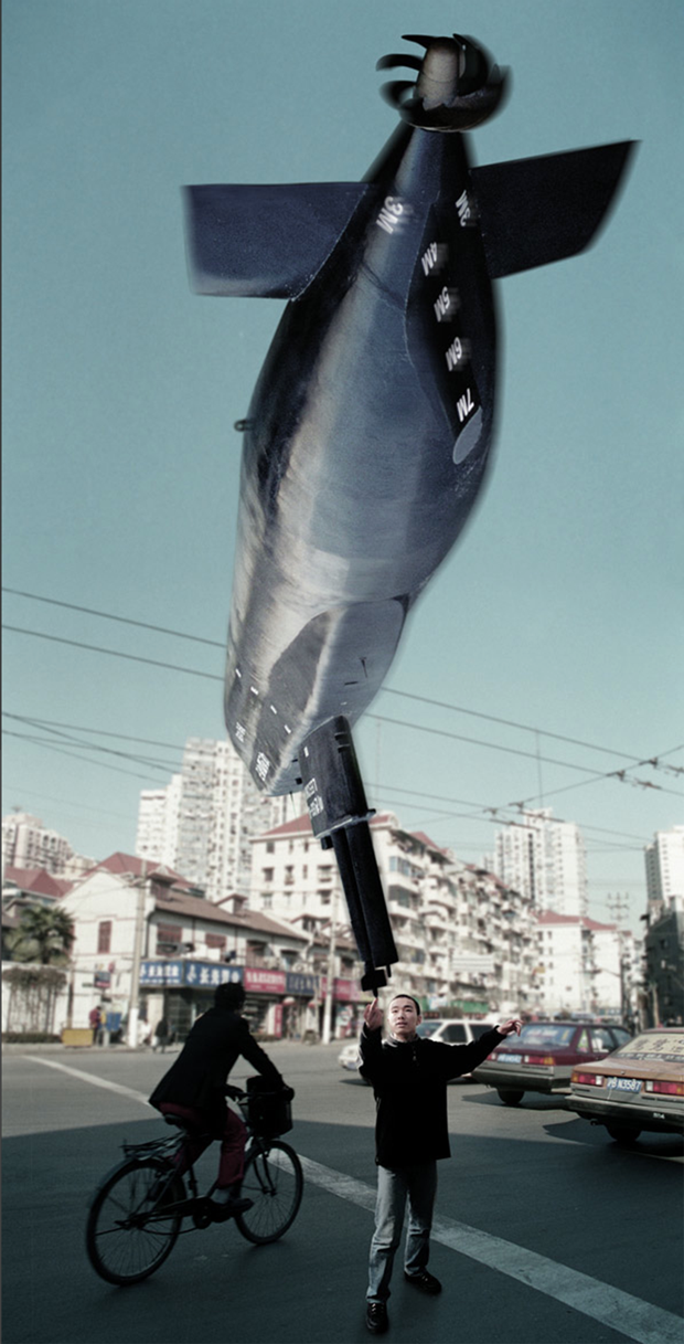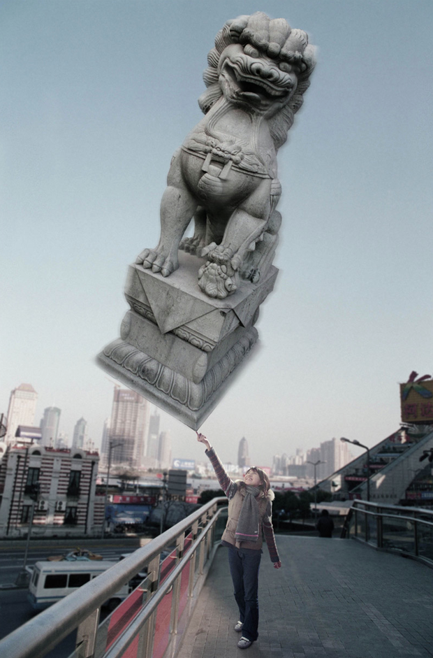 Todas las imágenes en la serie «Light as Fuck”(2002–03) de Yang Zhenzhong fueron tomadas en distintos lugares de Shanghai, en todas ellas una persona sujeta en la punta de un dedo algún objeto imposible, como un gigantesco león de piedra, una pieza pesada de maquinaria, un vehículo bélico o una pieza icónica de arquitectura como el Oriental Pearl Tower… ¿Así es la vida urbana moderna?, ¿liviana y aparentemente fácil?, ¿fácil de manejar? Mediante estos evidentes montajes fotográficos se mofa de los absurdos problemas de la ciudad moderna con sentido del humor, combinando la visión crítica de la vida urbana de la China actual bajo una pose ligera y divertida.